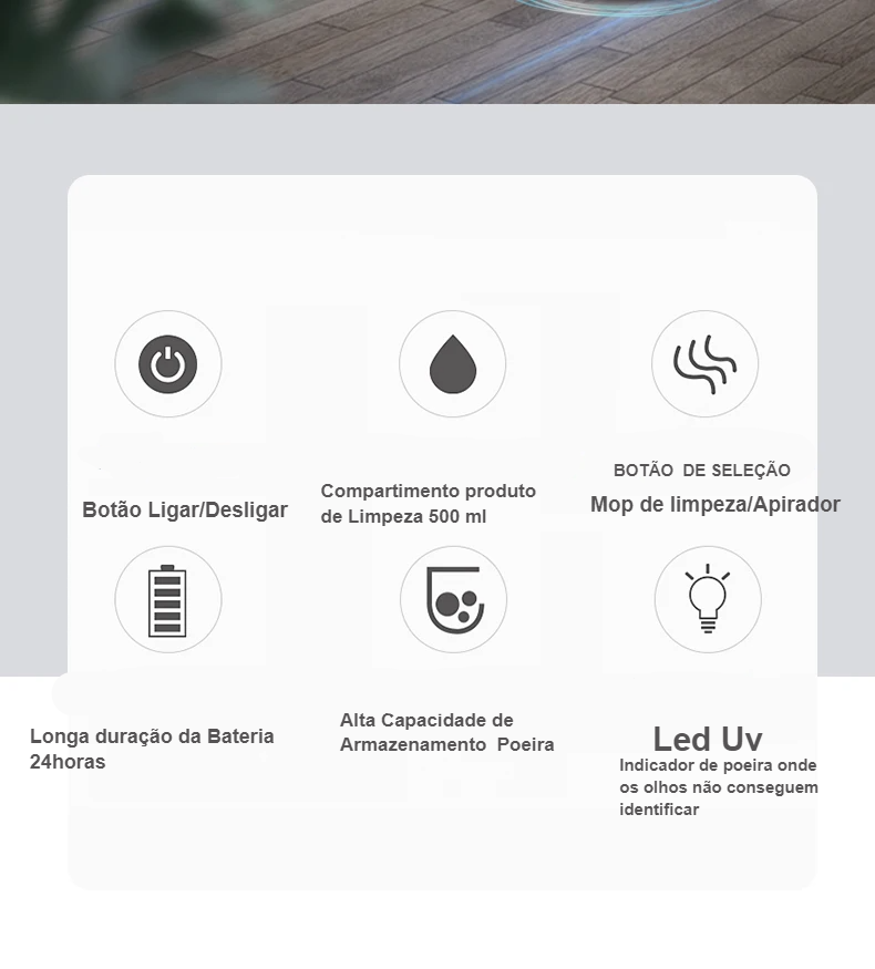- Dispensador de Produtos de Limpeza: Adicione seu produto favorito e ele será aplicado automaticamente durante a limpeza.